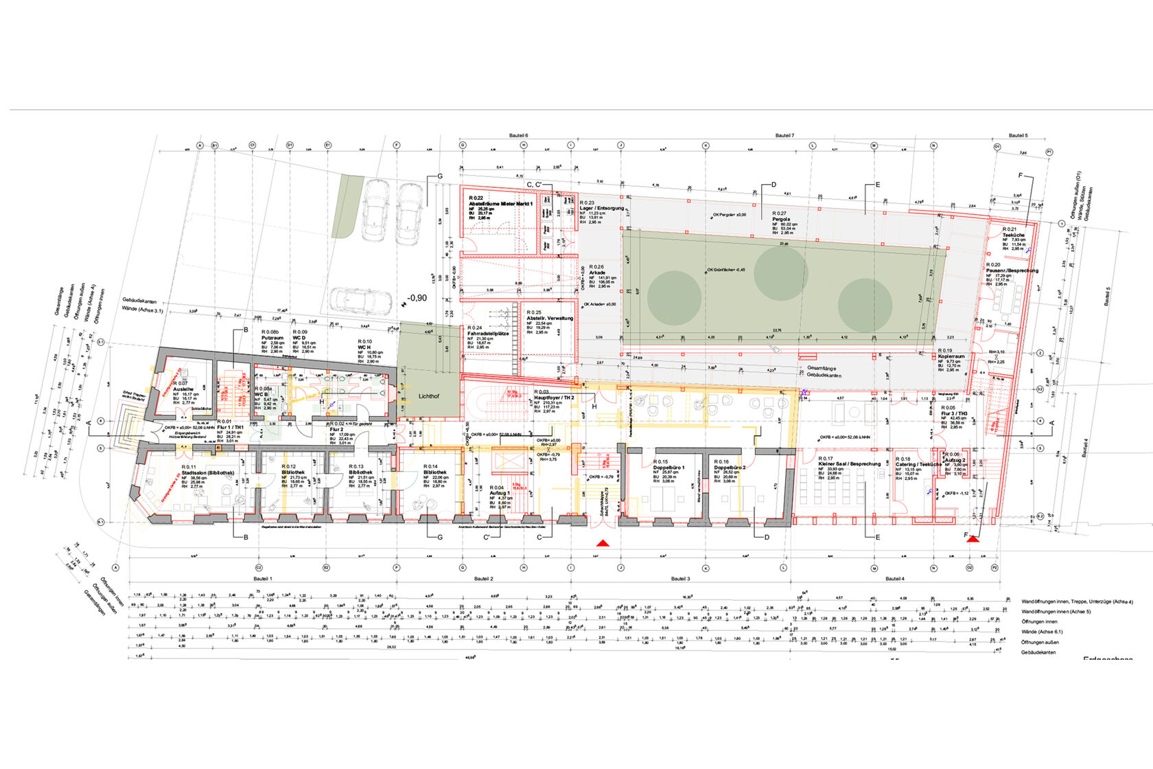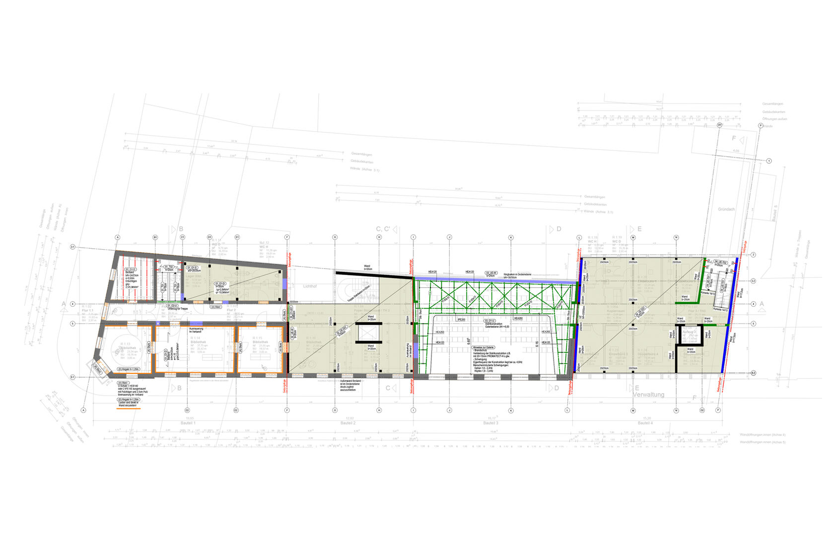 Im Gebäudeteil 3 wird die Decke über dem 1.Obergeschoss entfernt, so dass der Saal aus des Errichtungszeit wieder in seiner Form in Erscheinung tritt. Dieser Raum wird durch eine neue Galerie ergänzt, die als weitgespannte Stahlkonstruktion konzipiert wird. Punktuell erfolgt eine Abhängung in die Ebene des Dachgeschosses, um die gewünschte Stützenfreiheit im Saal zu gewährleisten.
