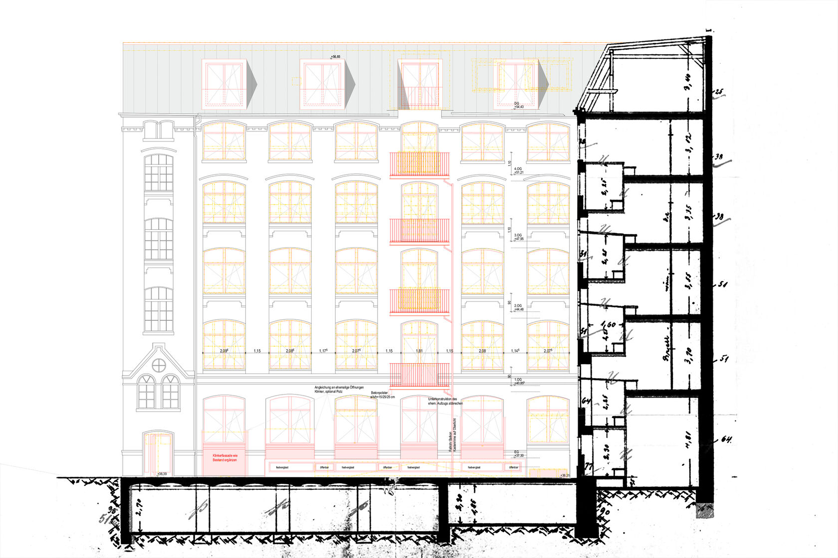 Das Fabrikgebäude wurde um 4 filigrane, frei abgespannte Stahlbalkone mit verdeckter Befestigung an Stahlriegeln auf der Innenseite der Außenwände ergänzt. Im 3. Obergeschoss wurde die Höhe der erforderlichen Absturzsicherungen durch behutsam in die Bestandsfassade eingesetzte Stahlelemente ertüchtigt.