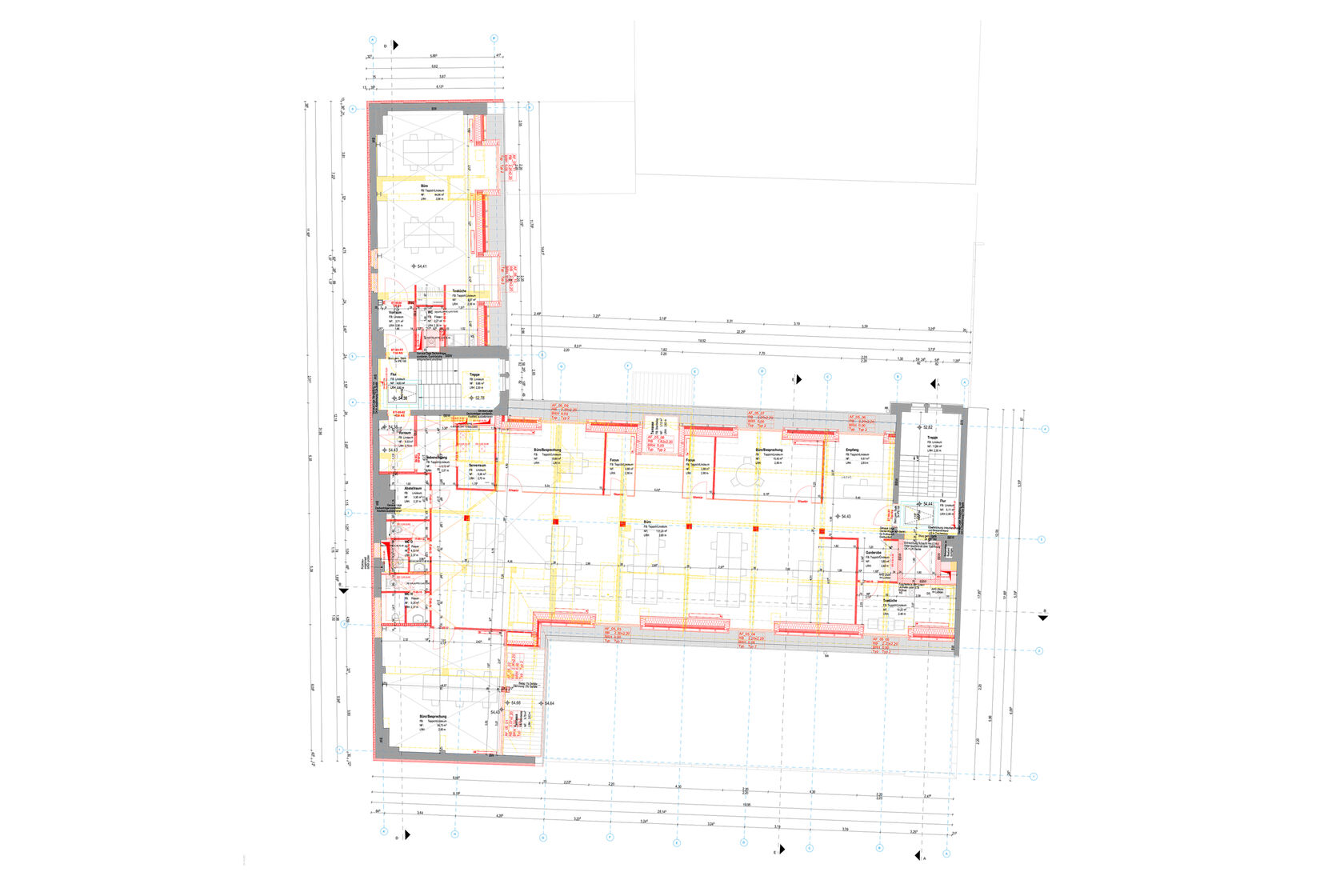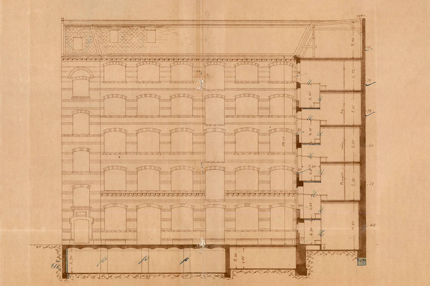 Zu Beginn der Planung standen keinerlei Bestandsunterlagen zum Tragwerk zur Verfügung. Mithilfe der Erstellung eines Programms zur technischen Bestandserkundung sowie Detailaufmaße wurde der Bestand vollumfänglich erfasst. Der Keller und Hofkeller befanden sich in einem sehr schlechten baulichen Zustand. Daher erfolgte eine Nachrechnung der Bestandsbauteile unter Berücksichtigung des Schädigungsgrades sowie der Gussstützen nach Käpplein bzw. mittels Lastvergleich.