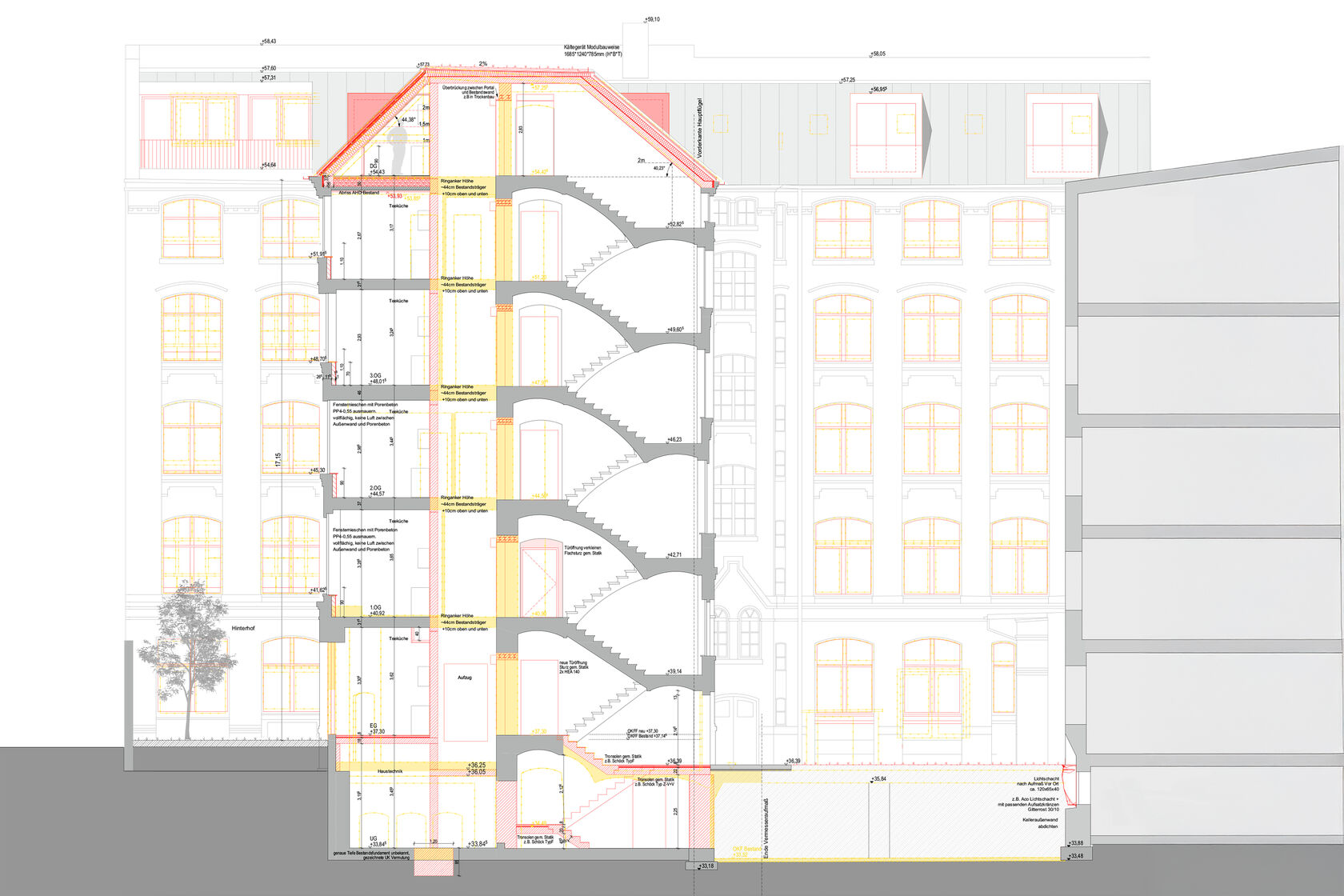Die Decke über dem Untergeschoss wurde bereichsweise tiefergelegt. Aufgrund großer Substanzschäden wurde die Hofunterkellerung in großen Teilen zurückgebaut und bereichsweise neu errichtet. Große neue Öffnungen in der bisherigen Kellerwand in Verbindung mit einem Lichtschacht gewährleisten eine ausreichende Belichtung.