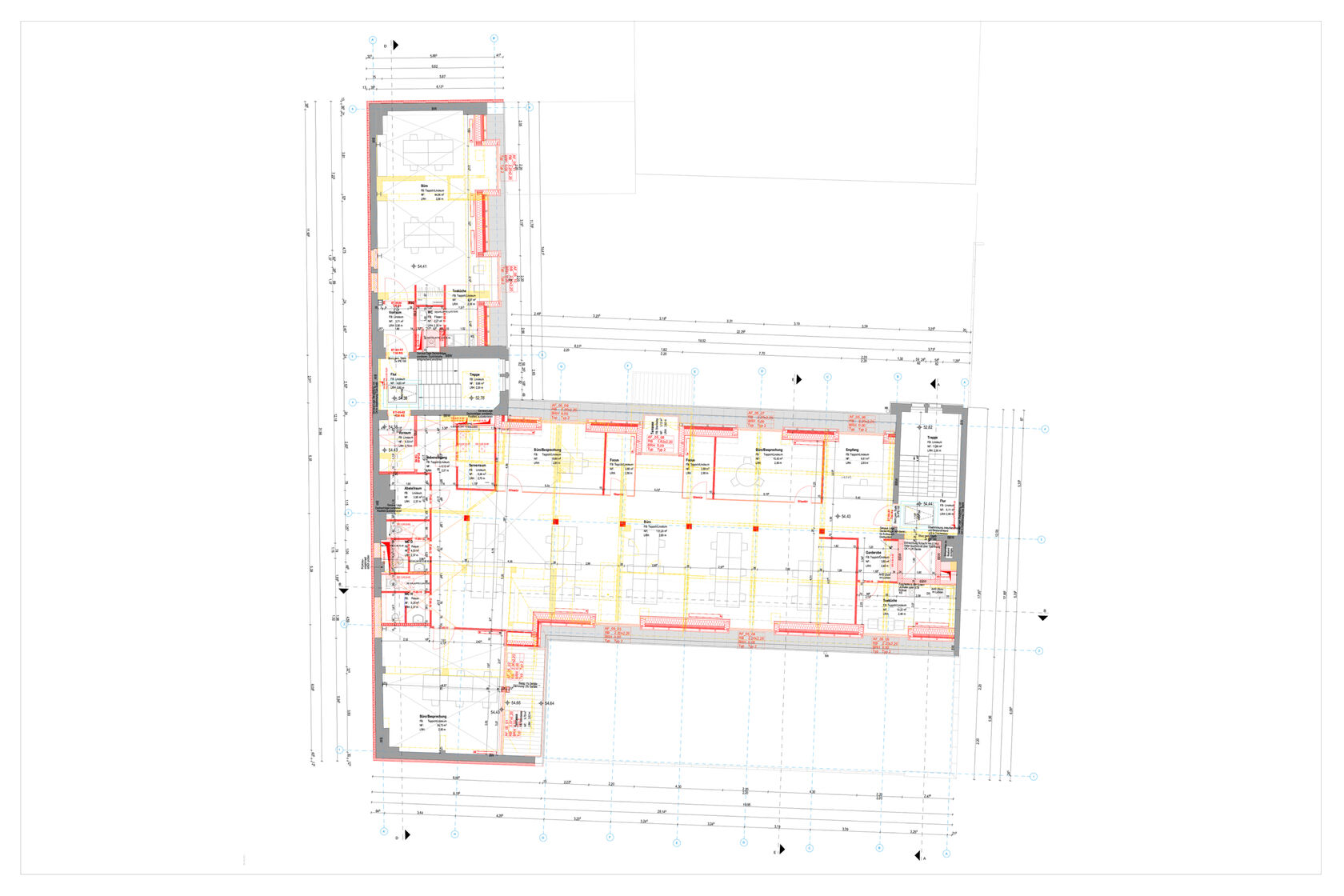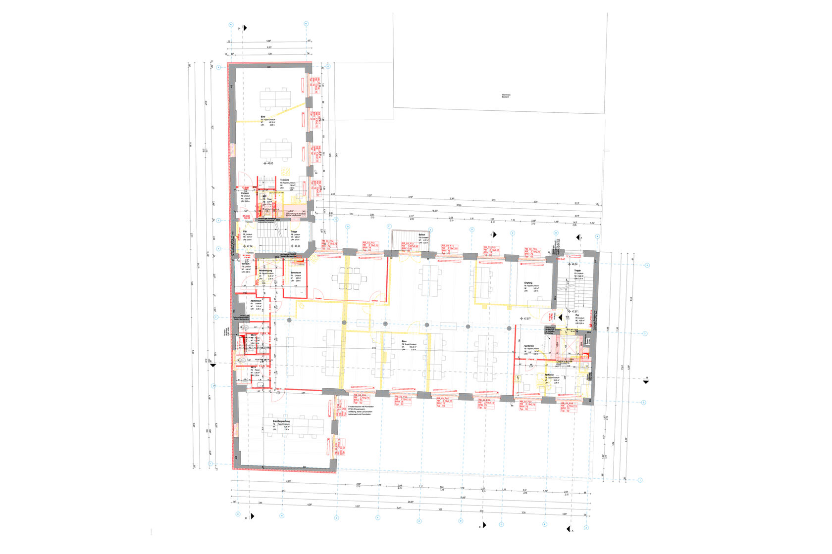 Das Dachtragwerk wurde aufgrund des schlechten Zustand und der gewünschten Flexibilität in der zukünftigen Raumnutzung durch eine hybride Holz-Stahlkonstruktion ersetzt. Die Bestandsdecken wurden saniert und brandschutztechnisch ertüchtigt. Für die barrierefreie Erschließung erfolgte der Einbau eines neuen Aufzuges. Aus dem Brandschutzkonzept folgend wurde eine neue Fluchttreppe zum UG eingebaut.